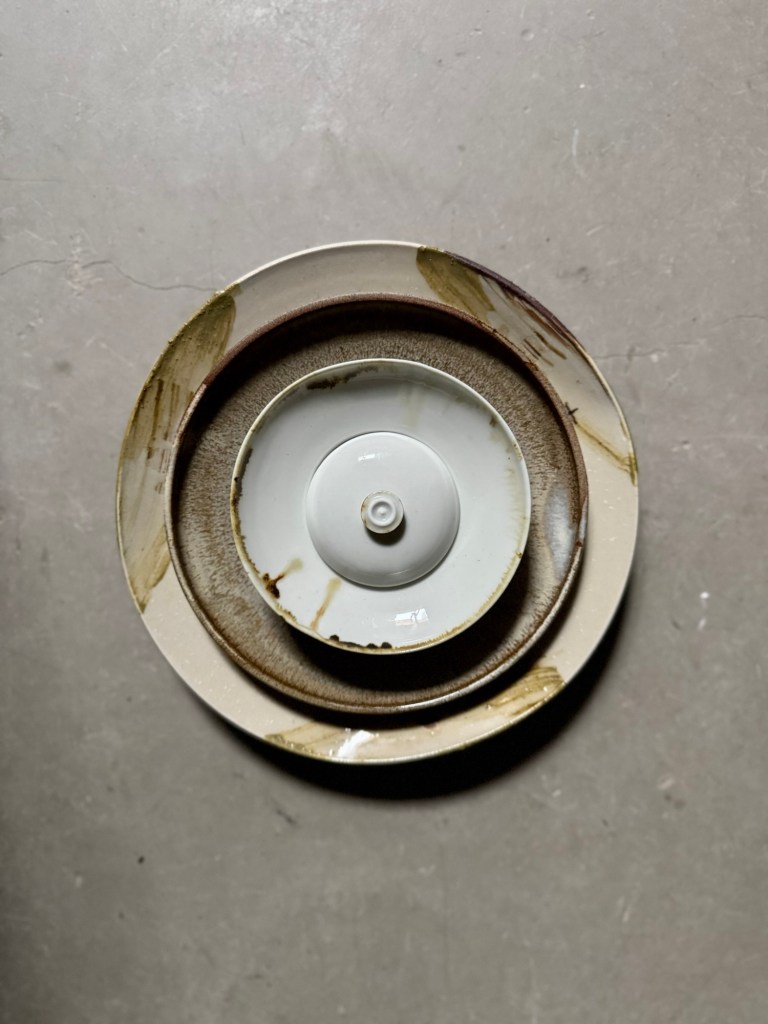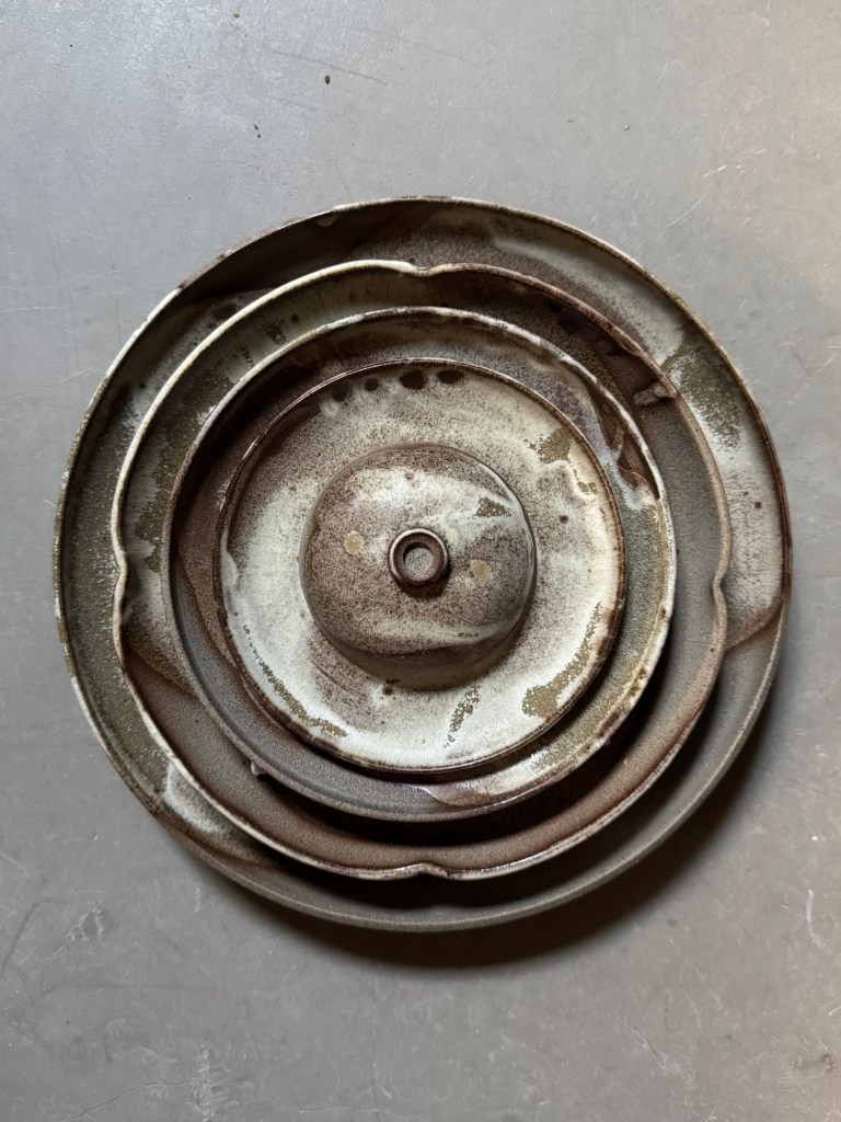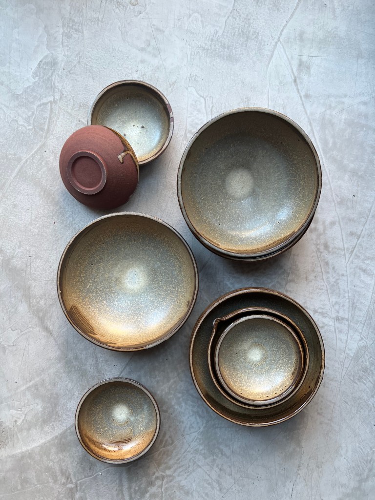 Set of bowls in grey stoneware and brown alabaster glaze with wood ash details.