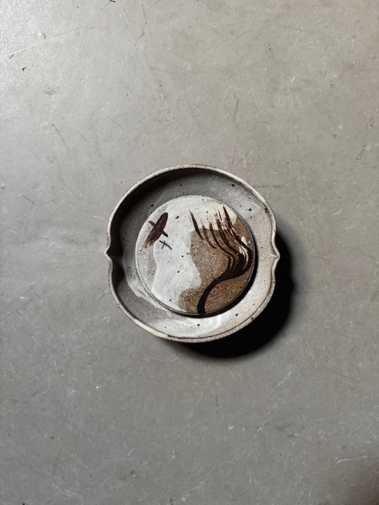 Shallow raised bowl with pinched rim, slib, pencil and iron oxide decoration with matte transparent glaze.