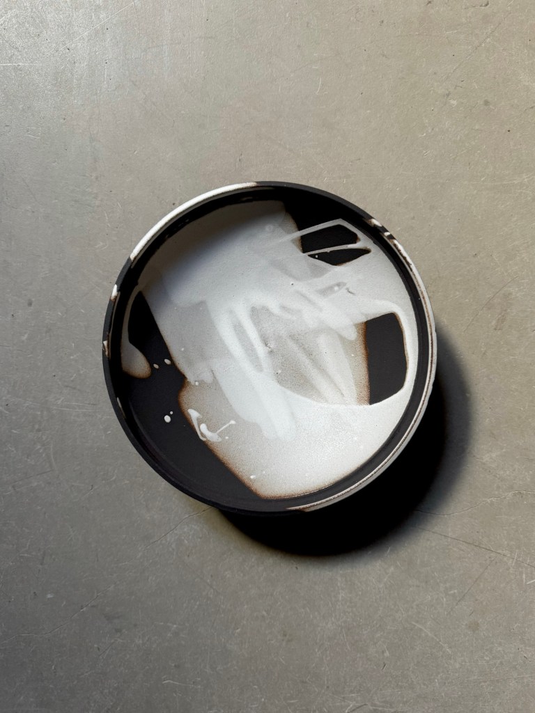 Bowl with wax resist detail on ungrogged black stoneware and matte white glaze